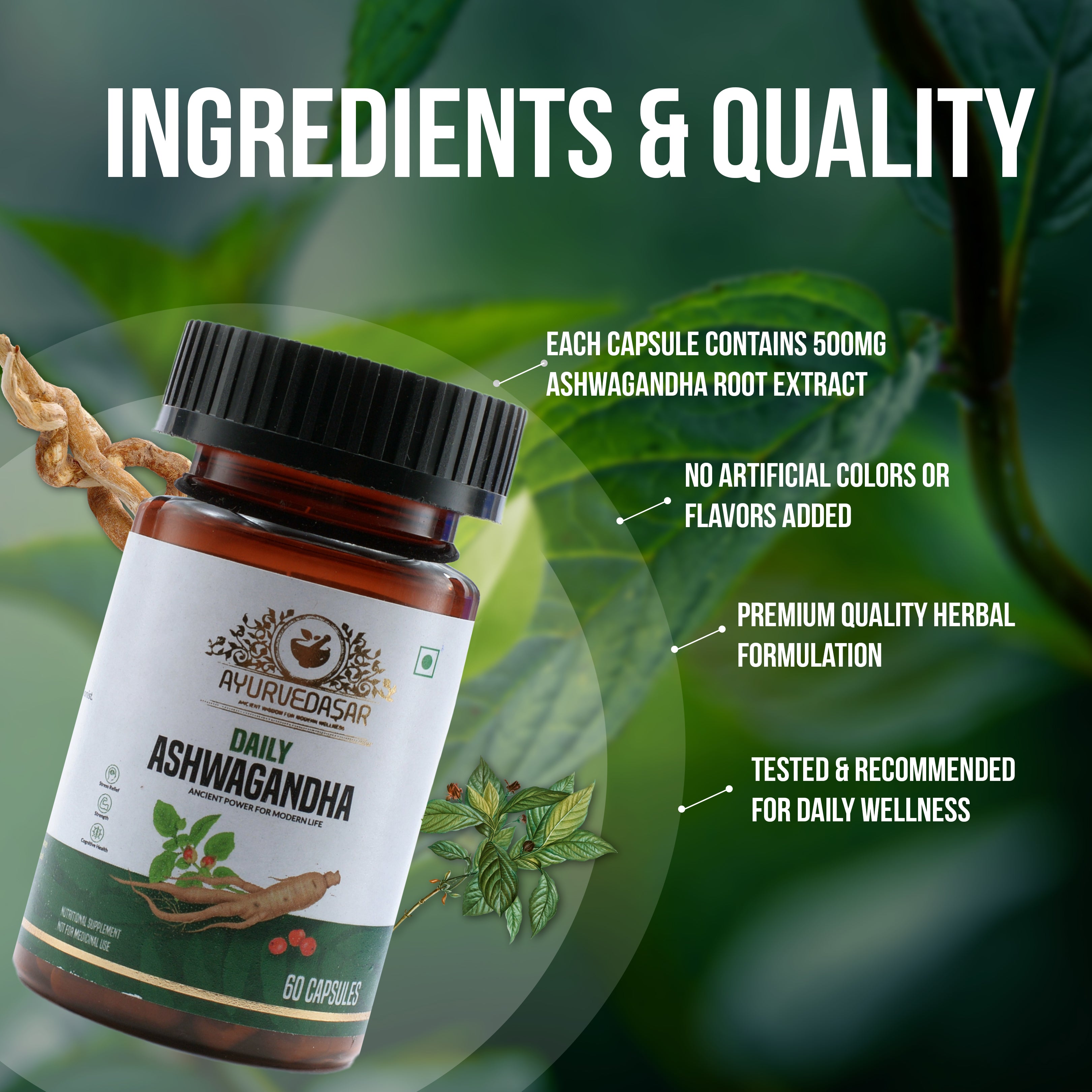 AYURVEDASAR Daily Ashwagandha is a high-quality Ayurvedic nutritional supplement containing 500 mg of pure Ashwagandha (Withania somnifera) root extract per capsule. Known for its adaptogenic properties, Ashwagandha helps the body manage stress, promotes relaxation, and boosts mental clarity. Regular use supports cognitive function, strengthens the body’s resilience to fatigue, and promotes heart wellness.