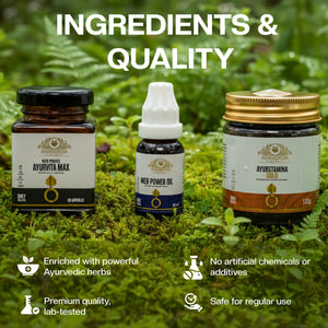 The Ayurvedasar Men Power Ayurvita Combo is a complete Ayurvedic wellness solution designed exclusively for men to enhance stamina, strength, and vitality — naturally. This premium 3-in-1 combo brings together the ancient wisdom of Ayurveda with modern wellness science to rejuvenate body, mind, and energy.