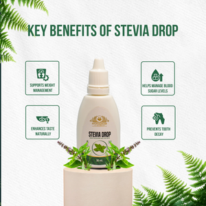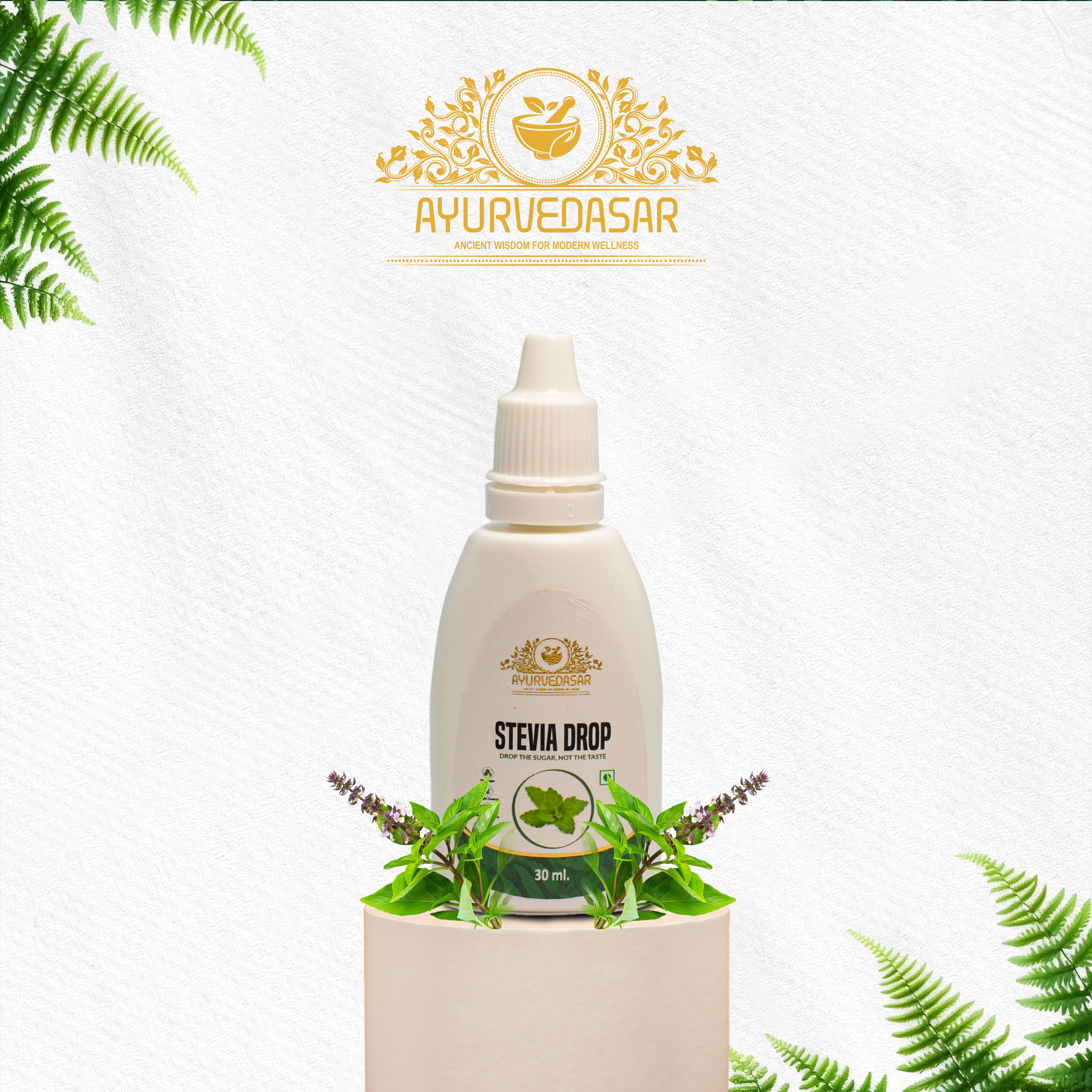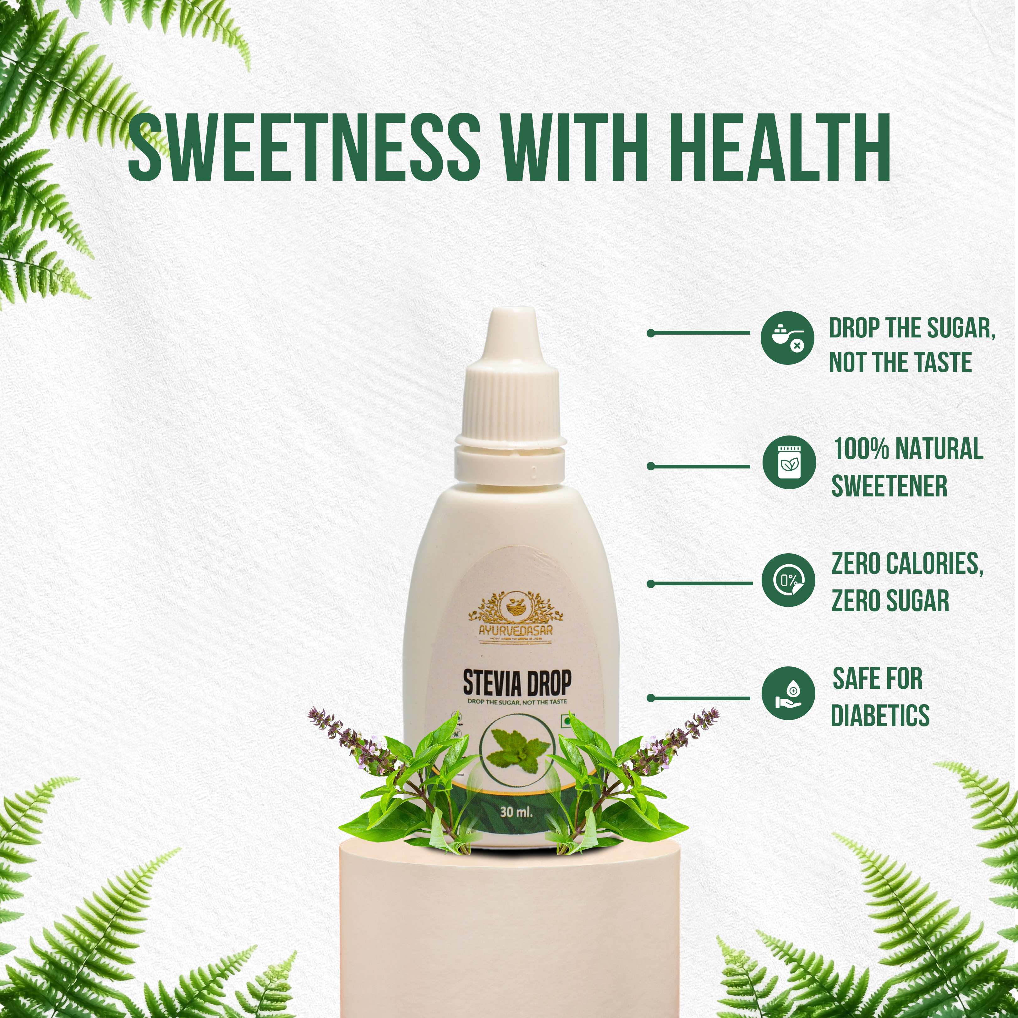 AYURVEDASAR Stevia Drop is a natural, plant-derived sweetener designed to provide the sweetness you love without the harmful effects of sugar. Made from high-quality Stevia powder, it contains zero calories, zero sugar, and is ideal for those looking to manage their weight, control blood sugar levels, or follow a diabetic-friendly diet. Its highly concentrated formula ensures that just 2–3 drops are enough to sweeten beverages, desserts, and recipes while avoiding spikes in blood glucose levels. Convenient and easy to carry, AYURVEDASAR Stevia Drop is a healthier alternative to artificial sweeteners and refined sugar.